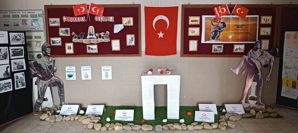 Görsel Sanatlar Öğretmenimiz Filiz ALGÜL ve Teknoloji Tasarım Öğretmenimiz Mustafa AKIN’ın hazırladığı ve okul girişinde sergilenen 18 mart Zaferi Pano ve Sahne Dekor tasarımı büyük beğeni topladı.